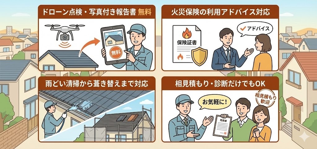 → はい。ドローン診断+写真付き報告書を無料で提供しています。