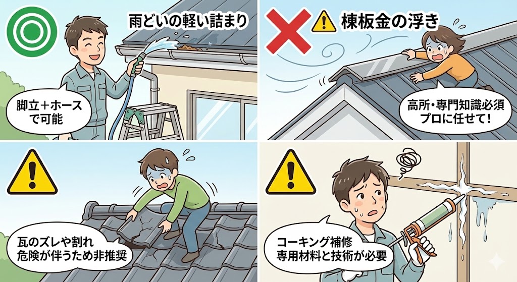 💡 屋根上は転落事故が多発。基本はプロに依頼するのが安全です。 ※DIYかプロ依頼か迷った場合は、「高さ」と「原因の特定」が判断基準になります。 ●脚立で安全に手が届く範囲か これらの条件を満たさない場合は、 無理にDIYを行わず、専門業者に相談する方が結果的に安全・安心です。 ※自己補修によるよくあるトラブル |