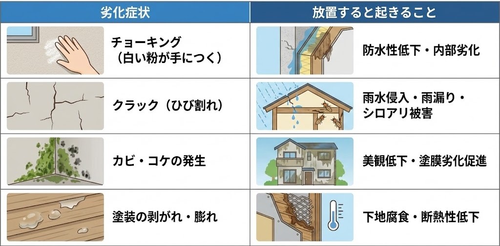 ただし「サイディングの浮き」「目地の割れ」がある場合は早急な対応が必須です。