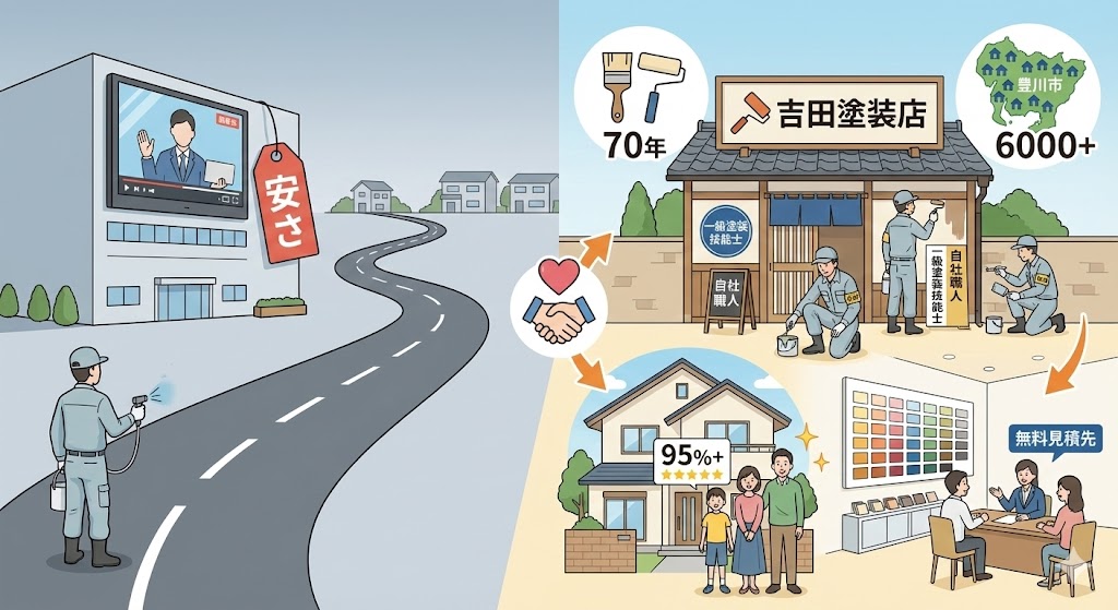 「安さ」や「テレビCM」で有名な大手もありますが、 地元密着型業者は対応が早く責任感が強い傾向があります。 たとえば 吉田塗装店 では: ●創業70年・豊川市で施工実績6,000棟以上 |