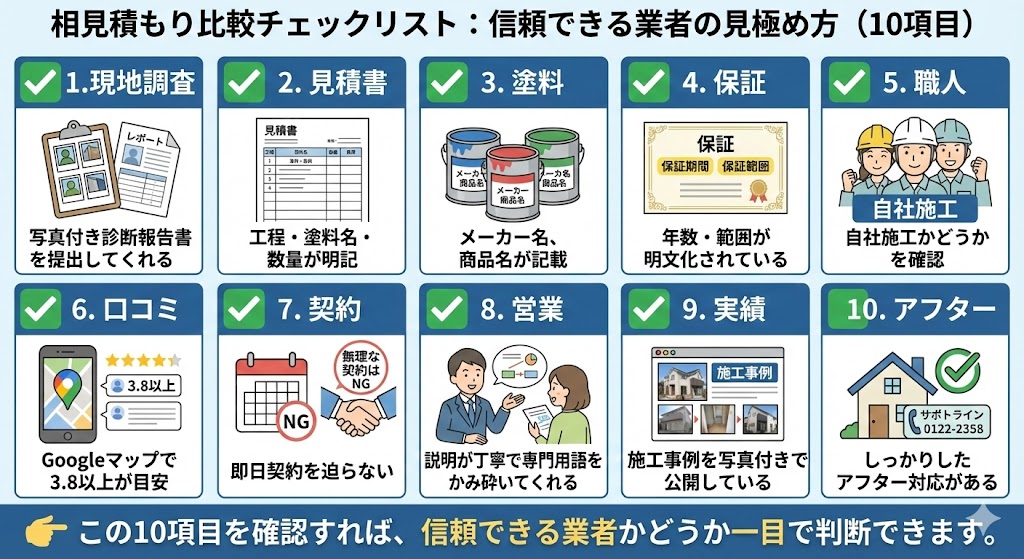 A. 見積書の詳細、保証内容、塗料のグレード、施工範囲を必ず確認しましょう。