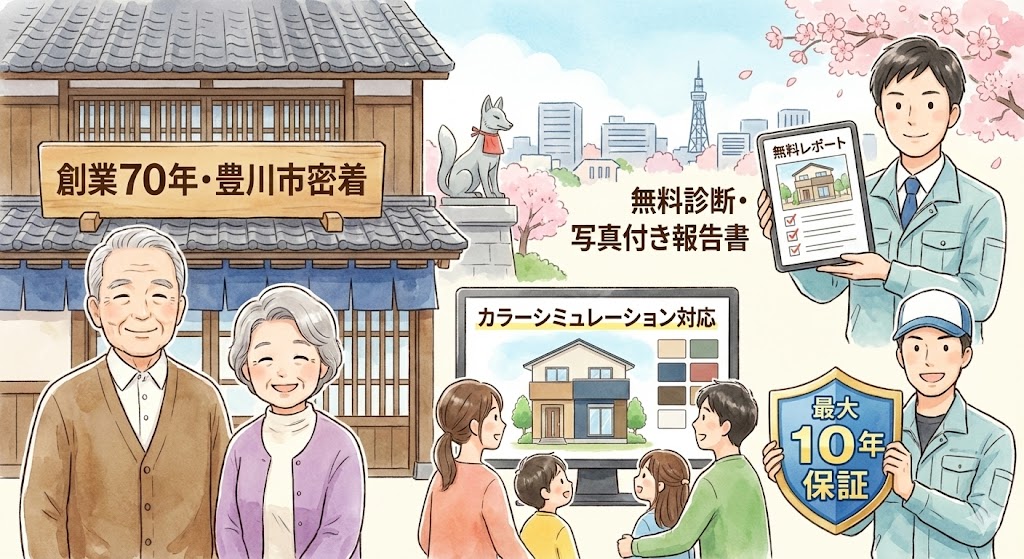●創業70年・豊川市密着 ●無料診断・写真付き報告書 ●カラーシミュレーション対応 ●最大10年保証つき |