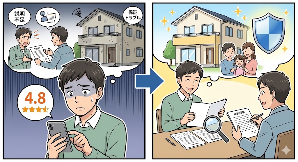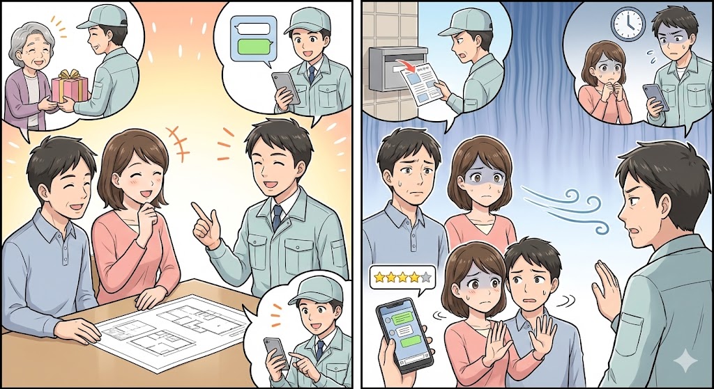 | 現地の段取り・近隣挨拶の言い回し・質疑のスピードは現場管理力の鏡。 クチコミで高評価でも、打合せの温度差を感じたら見送る勇気を。 |