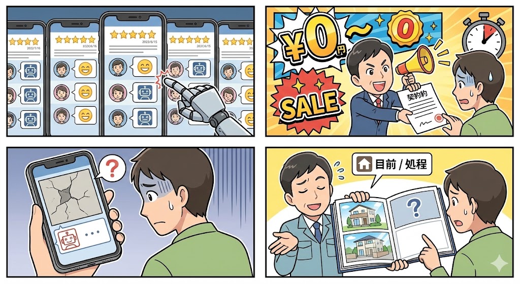 ●同日に★5が連投・文体が同じ/社員名の連呼で宣伝臭 ●「最安」「即決で大幅値引き」ばかり強調 ●施工の失敗を質問したら返信がないまたはテンプレ回答 ●写真が完成後の外観しかない(下地処理の証跡が皆無) |