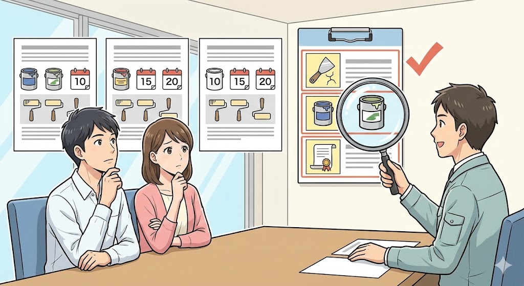 ② お見積もり・プラン提案●塗料の種類・耐久年数・施工方法を比較 ●相見積もりで「下地処理・塗料名・保証」の明記をチェック |