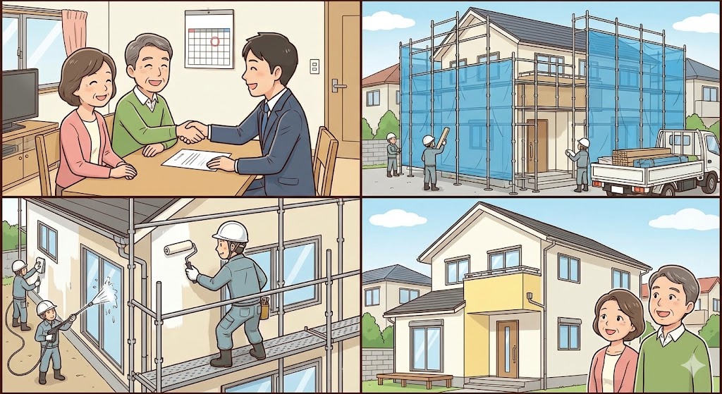 塗装工事は「契約 → 準備 → 工事 → 完了確認 → アフターサービス」の流れで進みます。