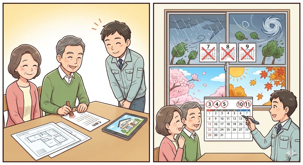 ③ 契約・工事日程調整●工事内容・保証・金額に納得したら契約 ●豊橋市では台風シーズン(7〜9月)を避け、春・秋の工事が人気 |