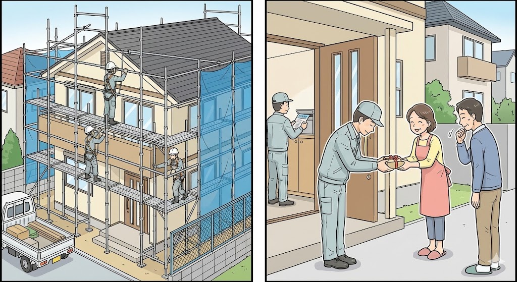 ④ 着工前準備●足場設置(安全対策の基本) ●近隣への挨拶回り(騒音・洗浄水への配慮) |