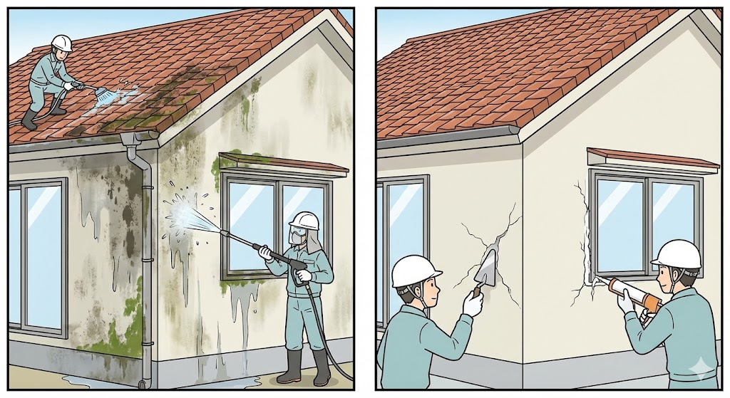 ⑤ 高圧洗浄・下地処理●外壁・屋根の汚れやカビを除去 ●クラック補修・シーリング打ち替えなど下地補修を実施 |
