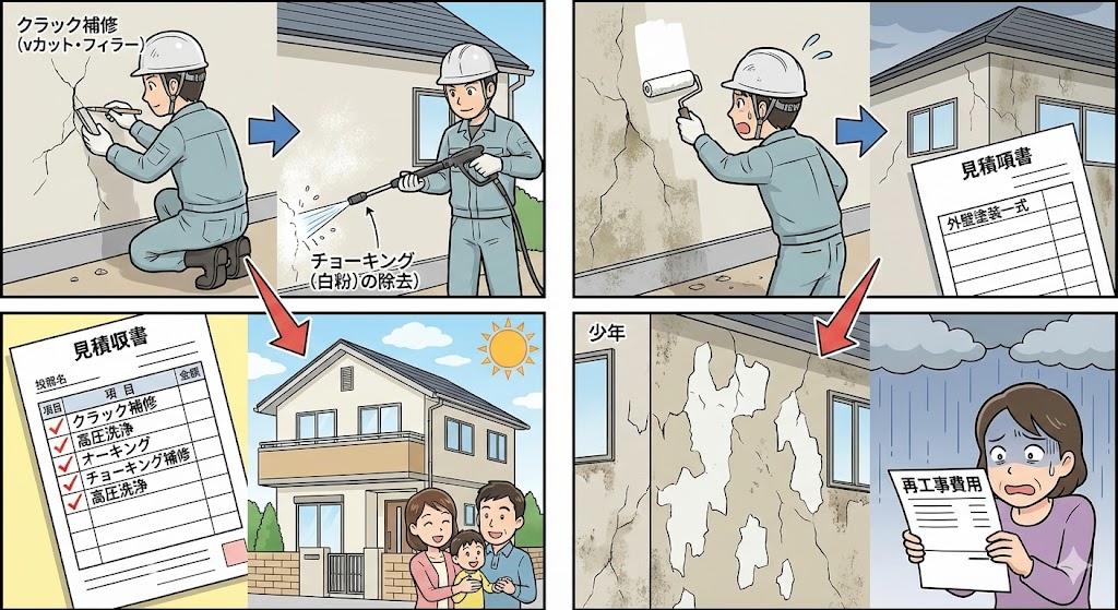 ●チョーキングやひび割れ補修の記載があるか? ●「外壁塗装一式」だけの見積もりは危険 👉 下地処理がなければ数年で塗膜が剥がれ、再工事費用が発生します。 |