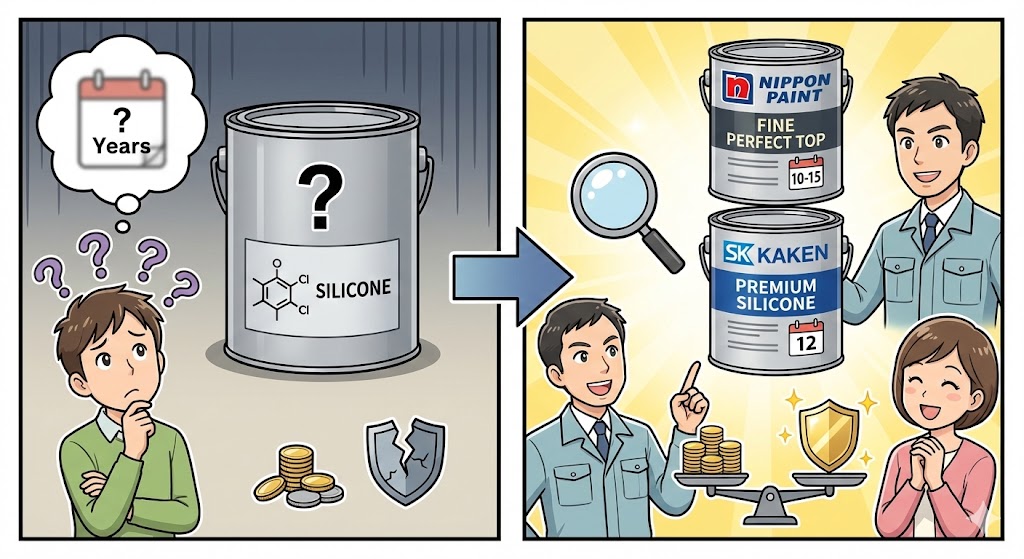 ●「シリコン塗料」だけでは曖昧 〇例:日本ペイント「ファインパーフェクトトップ」耐用10〜15年 〇例:エスケー化研「プレミアムシリコン」耐用12年 👉 同じ「シリコン」でも価格と耐久性は大きく異なります。 |