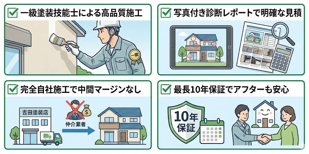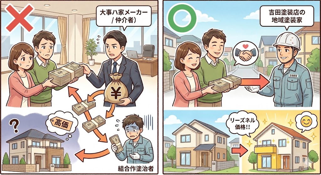 ✅ 方法①:地元の専門店に直接依頼する大手ハウスメーカーや仲介業者を通すと、中間マージンが20〜30%発生します。 吉田塗装店は完全自社施工。 |