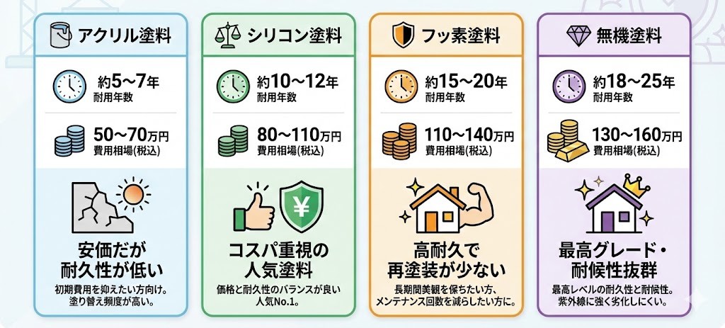 築年数や今後の住まい計画を考慮し、シリコン塗料を選ぶのが最もコスパ◎。