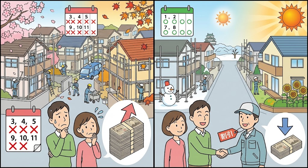 ✅ 方法③:繁忙期を避けて“閑散期”を狙う塗装業界の繁忙期は3〜5月、9〜11月。 豊橋市は冬でも比較的温暖なため、冬施工でも品質に問題はありません。 |