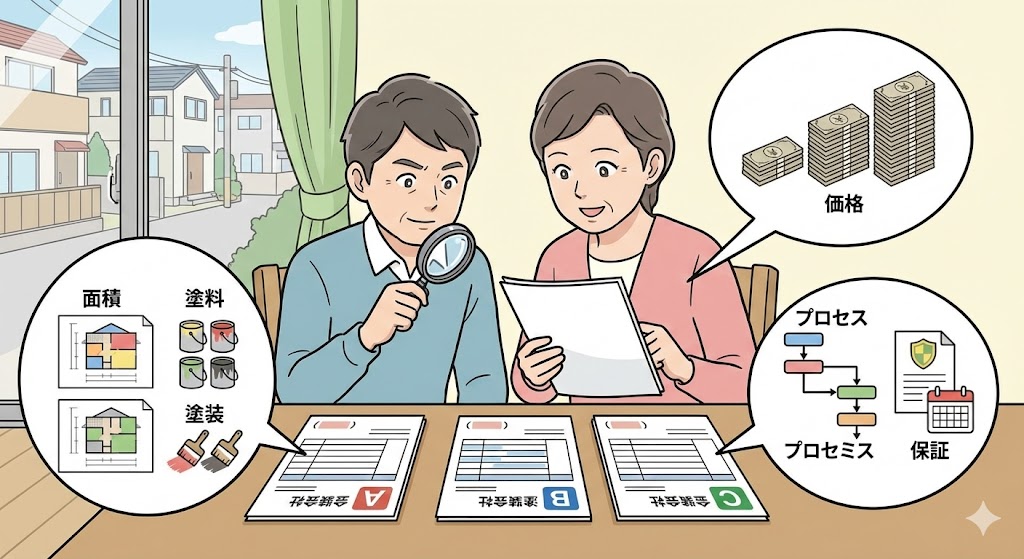 | 最低2〜3社の見積もりを取り、塗布面積・塗料名・塗回数を比較しましょう。 価格だけでなく、工程や保証の内容にも注目することが重要です。 |