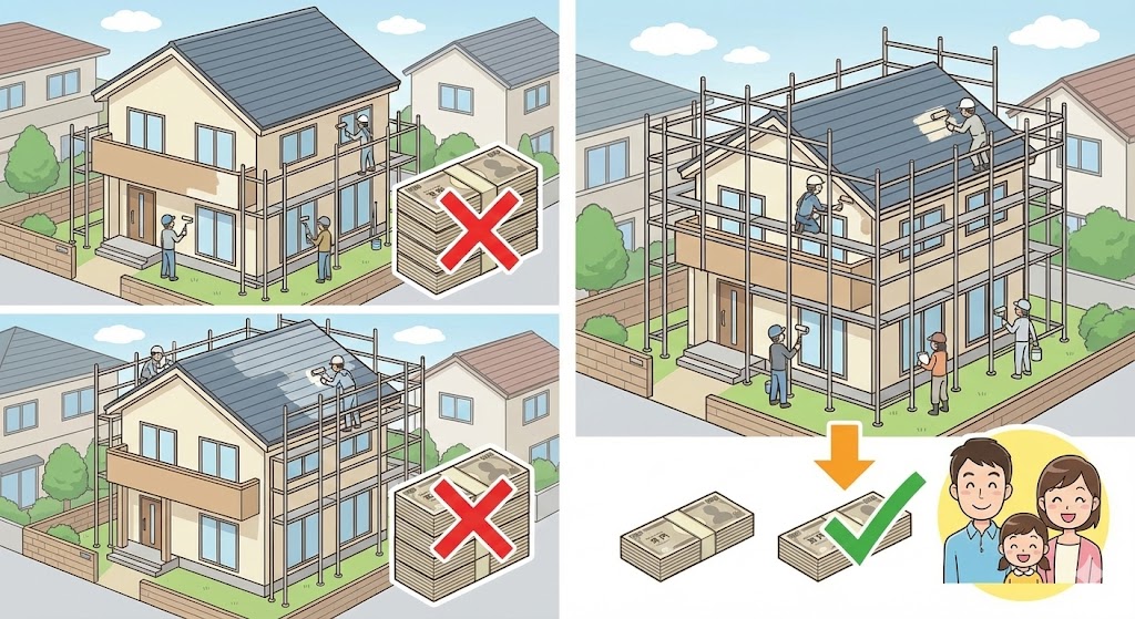 → 外壁と屋根を同時施工して足場費を1回分にすることです。