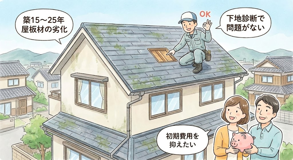 ●築15〜25年、屋根材のみ劣化している ●下地診断で問題がない ●初期費用を抑えたい ●スレート屋根の住宅(御津町・蔵子などで多い) |