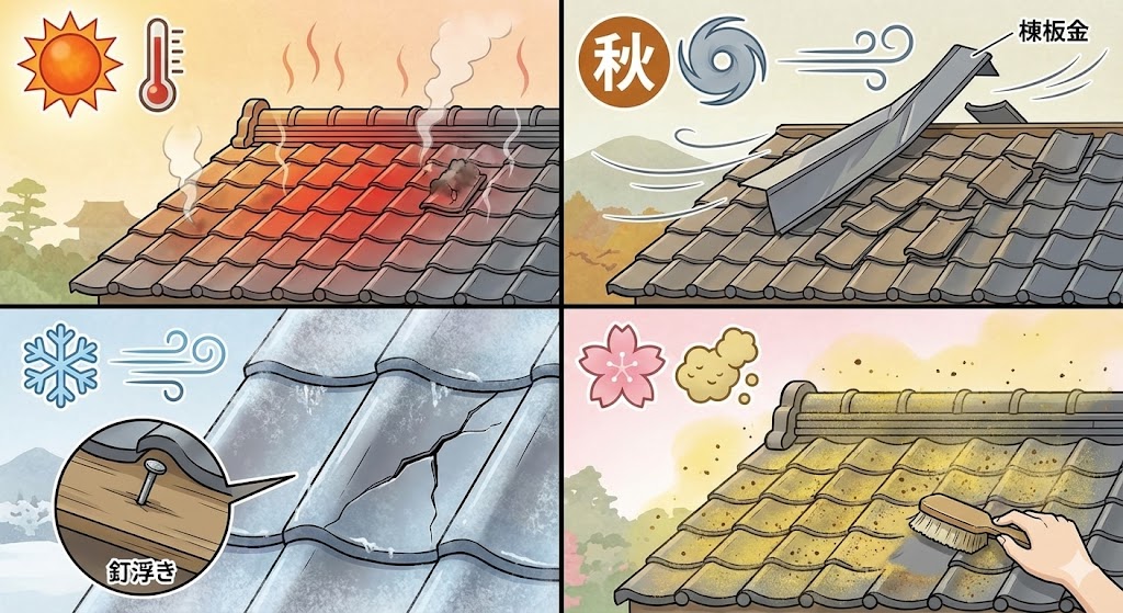 豊川市は四季の変化が大きく、屋根への負担が全国的にも強めです。 〇夏:猛暑日35℃超、屋根表面は70℃以上 〇秋:台風や強風で棟板金や瓦がズレやすい 〇冬:乾燥した西風で釘浮き・霜でひび割れ 〇春:黄砂・花粉で屋根表面が汚れやすい 👉 断熱性・耐風性・防水性・耐汚染性を兼ね備えた施工が必須です。 |