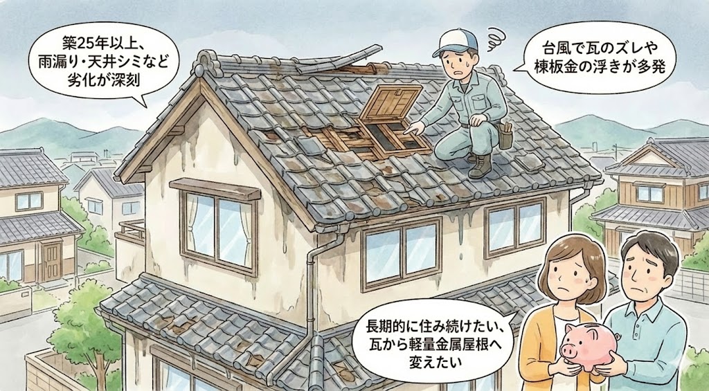 ●築25年以上 ●雨漏り・天井シミなど劣化が深刻 ●台風で瓦のズレや棟板金の浮きが多発 ●長期的に住み続けたい ●瓦から軽量金属屋根へ変えたい |
