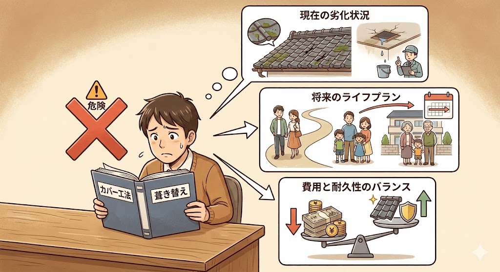 「カバー工法か葺き替えか?」を机上で決めるのは危険です。 ●現在の劣化状況 ●将来のライフプラン ●費用と耐久性のバランス |