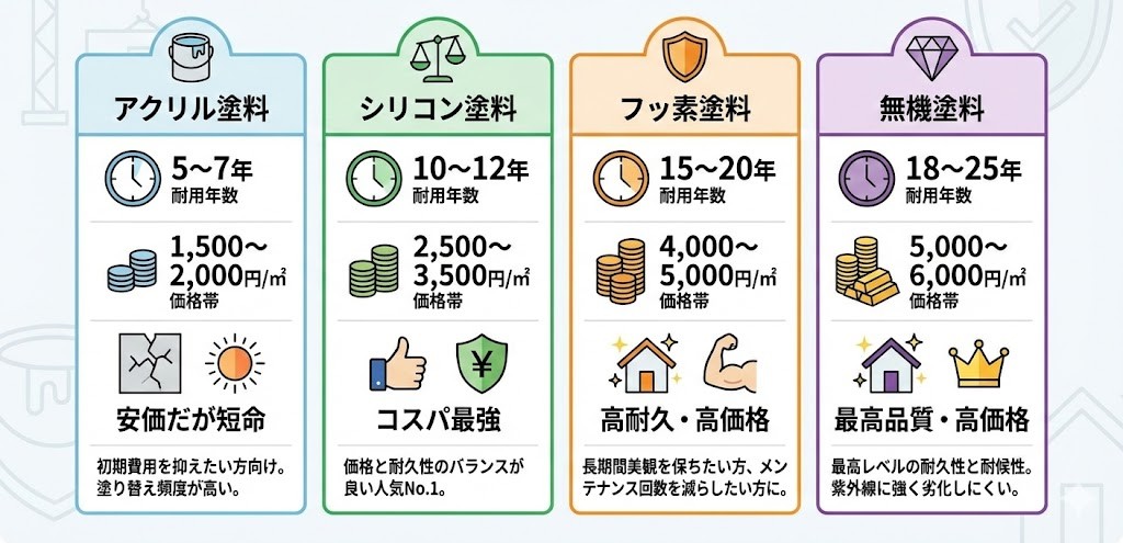 無機塗料やフッ素塗料は高耐久ですが、その分価格も高め。