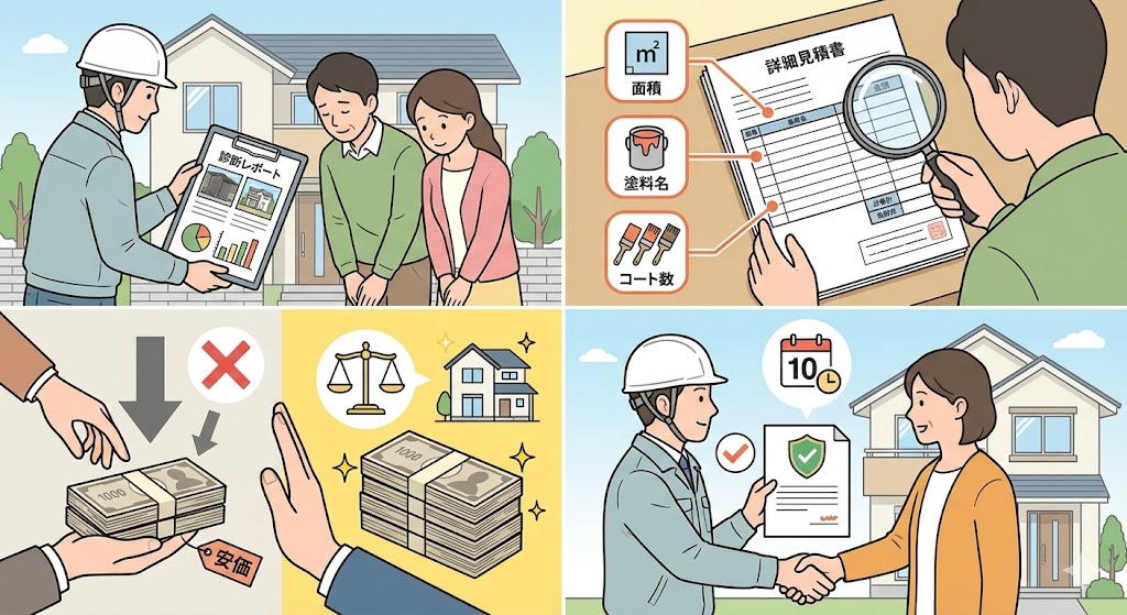 | ✅ 信頼できる業者の「診断報告書」をもらう ✅ 見積書に「塗布面積・塗料名・回数」が明記されているか確認 ✅ 安すぎる価格に飛びつかない ✅ アフター保証があるかチェック |
