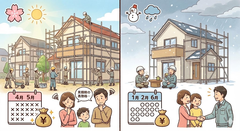 塗装業界には**繁忙期(3〜5月、9〜11月)と閑散期(1〜2月、7〜8月)**があります。 豊橋市では梅雨や台風を避けて、冬〜早春の施工が狙い目です。 |