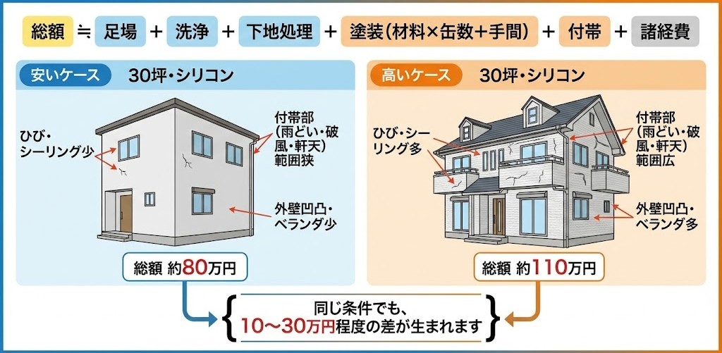 ●シーリング打ち替え全面・下地補修が多い場合は**+5〜20万円**程度増えることがあります。