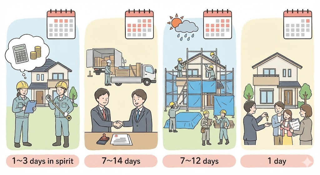 ●現地調査・見積:1〜3日 ●契約〜着工準備:7〜14日 ●工事期間:7〜12日(天候で前後) ●完了検査・引渡し:1日 梅雨・台風期は予備日を見込んだ計画が安心です。 |