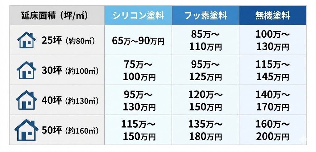 (足場・洗浄・3回塗り・付帯の一部含む一般的な仕様の概算/税込)