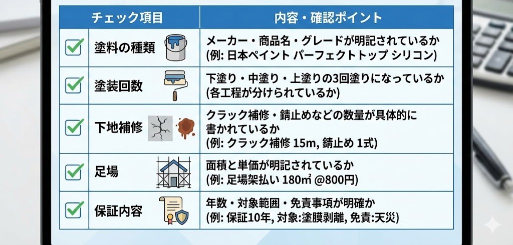 ✔ 足場・洗浄・補修・塗料の種類・回数 が細かく明記されているかを必ず確認。
