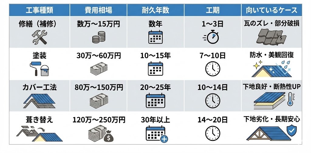 実は屋根工事には複数の方法があり、劣化の進行度・予算・暮らし方によって選ぶべき工法が変わります。