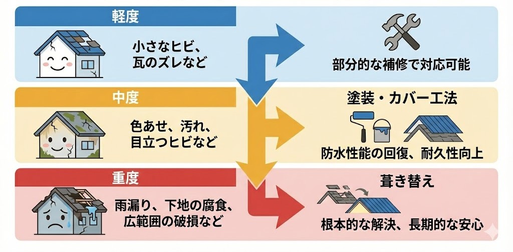 A. 雨漏りがなく劣化が軽度なら補修、繰り返す不具合や下地劣化がある場合は全面工事が必要です。