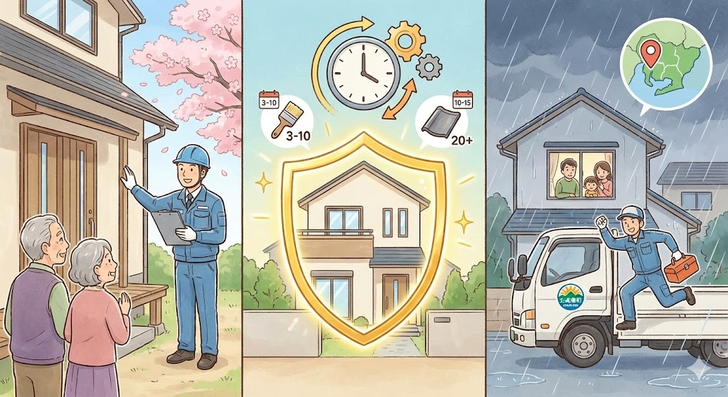 ③ アフターフォローの充実●工事後の定期点検 ●保証期間(塗装3〜10年、カバー工法10〜15年、葺き替え20年以上) ●緊急時にすぐ対応できる地元業者 👉 長期的に見て「頼んでよかった」と思える条件です。 |