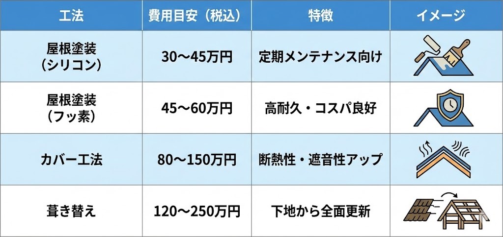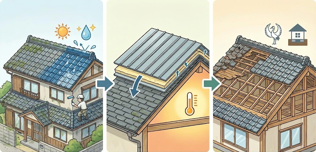 ② 適切な工法の選択●築10〜15年:屋根塗装で防水性回復 ●下地が健全な場合:カバー工法で断熱性も向上 ●築30年以上・下地劣化:葺き替えで寿命延長 👉 成功した方の多くは、劣化状況に合った工法を選んでいます。 |