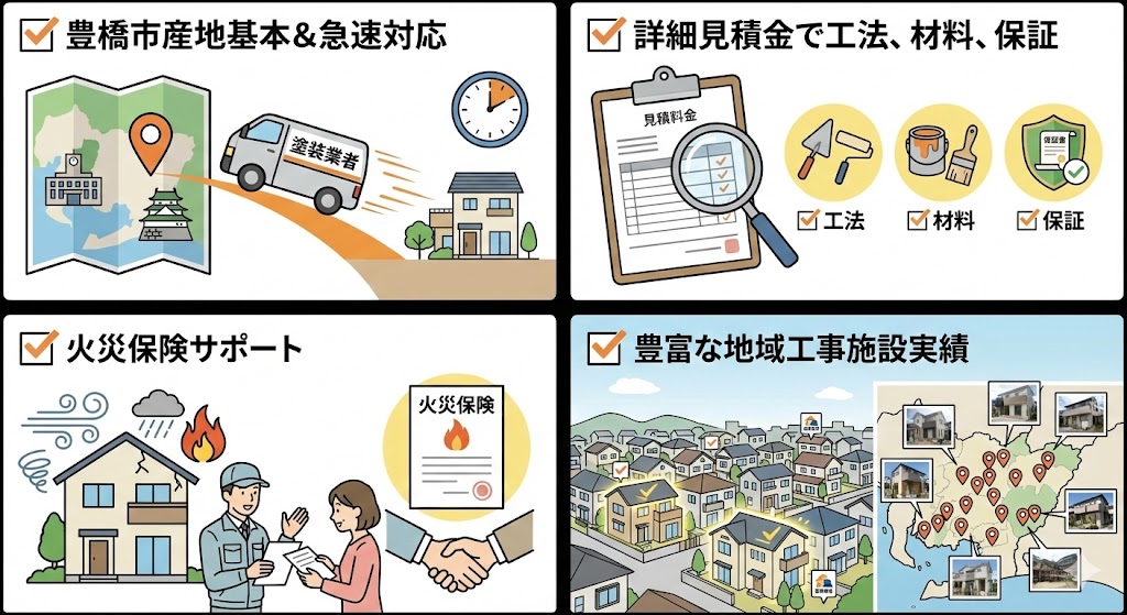 ✅ 豊橋市に拠点があるか?(緊急時対応の早さ) ✅ 見積書に「工法・材料・保証」が明記されているか? ✅ 火災保険のサポートが可能か? ✅ 過去の施工実績が地域に豊富か? 👉 これらを満たす業者を選ぶことが「成功事例」に直結します。 |
