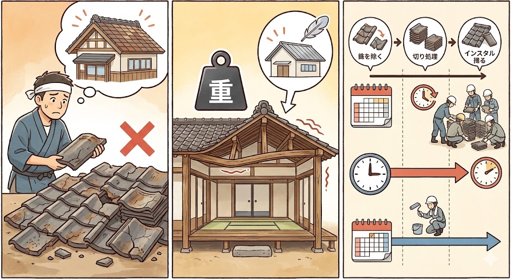 ●瓦の状態が悪ければ再利用不可 ●重量はそのまま ●工期が長くなることも |