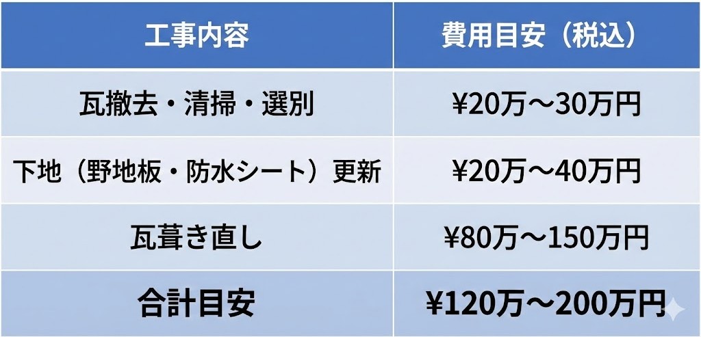 💡 葺き替え(全面新規瓦)より 20〜30%程度安くなるケースが多いです。