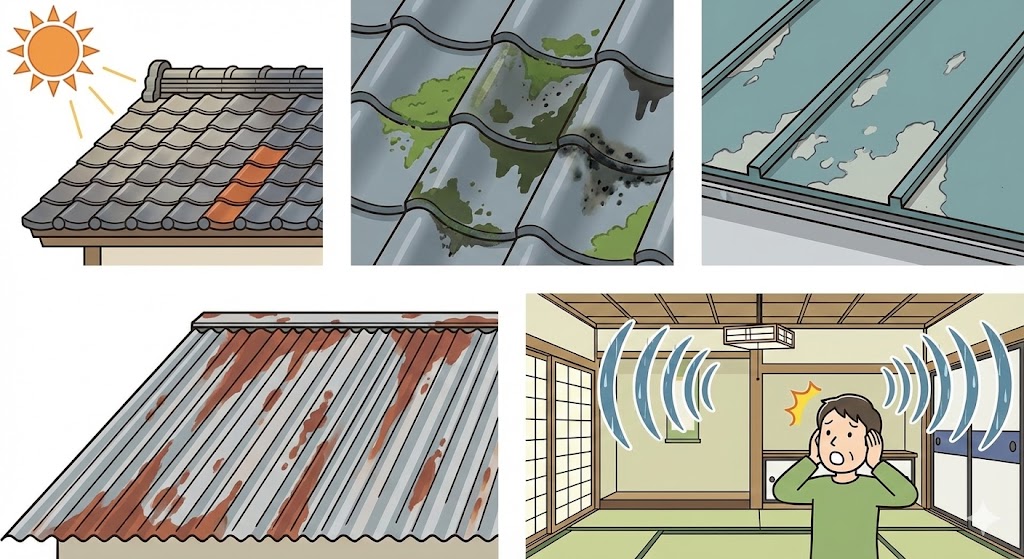 屋根は普段目に入りにくいため、劣化を見逃しやすい場所です。以下の症状が見られたら塗装・修理の検討が必要です。